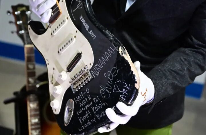 Una guitarra destrozada en el escenario por Kurt Cobain, líder del grupo Nirvana, será subastada a finales de mayo en...