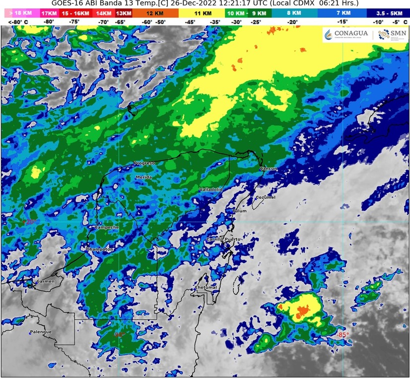 En la Península de Yucatán, el cielo estará nublado con lluvias puntuales muy fuertes en Quintana Roo, así como fuertes en Campeche y Yucatán.