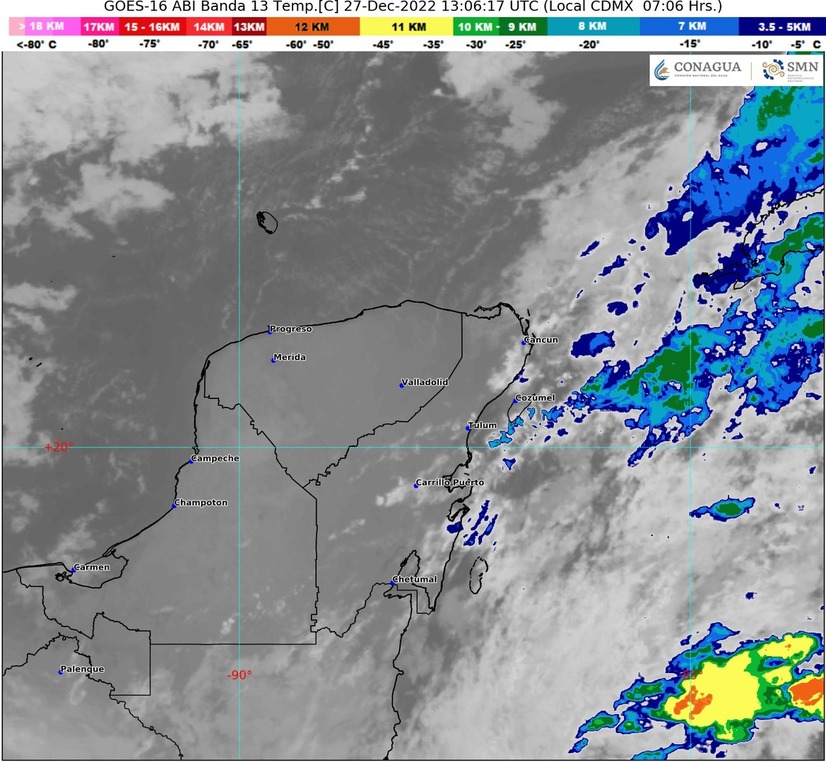 En la Península de Yucatán, el cielo estará medio nublado a nublado con probabilidad de chubascos en Yucatán y Quintana Roo, y lluvias aisladas en Campeche.