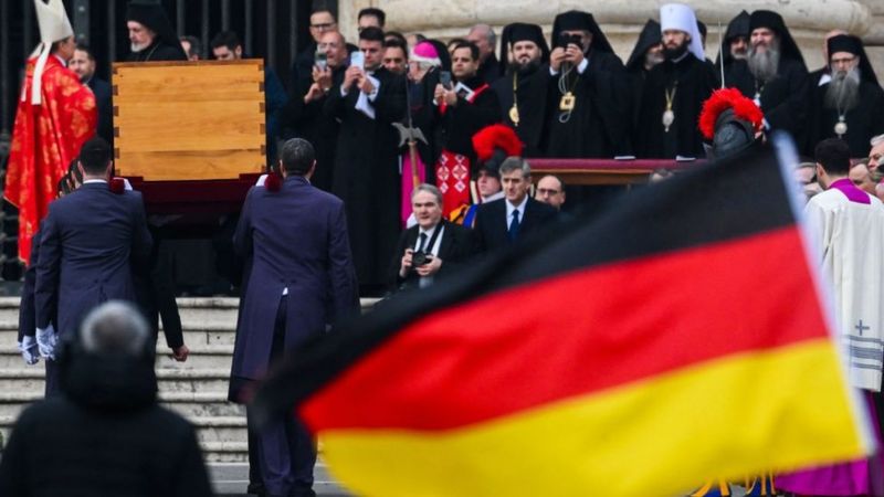 Antes de entrar en la basílica, el papa Francisco que presidió el funeral se detuvo de pie algunos minutos delante del féretro y puso su mano sobre él.
