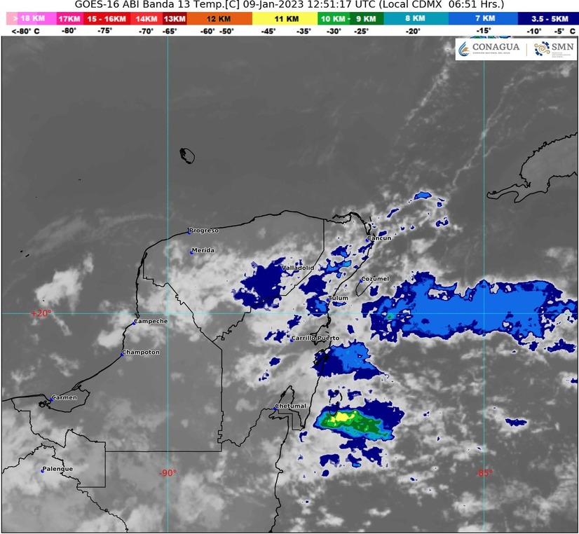 En la Península de Yucatán, el cielo estará medio nublado a nublado durante el día, con lluvias puntuales fuertes en Quintana Roo, así como chubascos en Campeche y Yucatán, todas con descargas eléctricas.