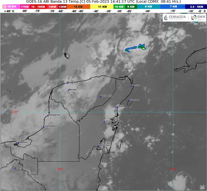 Para hoy 5 de febrero de 2023, el Servicio Meteorológico Nacional pronostica que el frente número 28 continuará con características de estacionario sobre la Península de Yucatán y el sureste del país; propiciará lluvias con chubascos en dicha península y lluvias puntuales fuertes en Veracruz, Tabasco, Oaxaca y Chiapas.