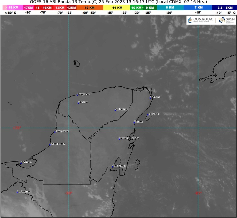 En la Península de Yucatán, el cielo estará parcialmente nublado a medio nublado, con lluvias aisladas en Campeche y Quintana Roo; sin lluvias en Yucatán.