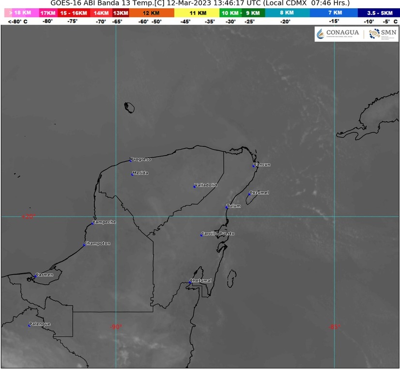 Para la Península de Yucatán pronostican cielo medio nublado durante el día, sin lluvia en la región. Ambiente templado al amanecer y caluroso por la tarde. Viento de componente este de 15 a 25 km/h con rachas de 40 a 60 km/h y tolvaneras en Campeche y Yucatán.