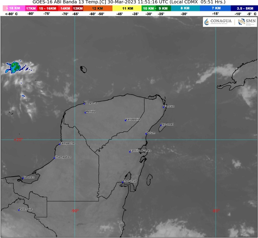 En la Península de Yucatán, el cielo estará despejado por la mañana y medio nublado por la tarde con probabilidad de lluvias aisladas en Quintana Roo; sin lluvia en el resto de la región.