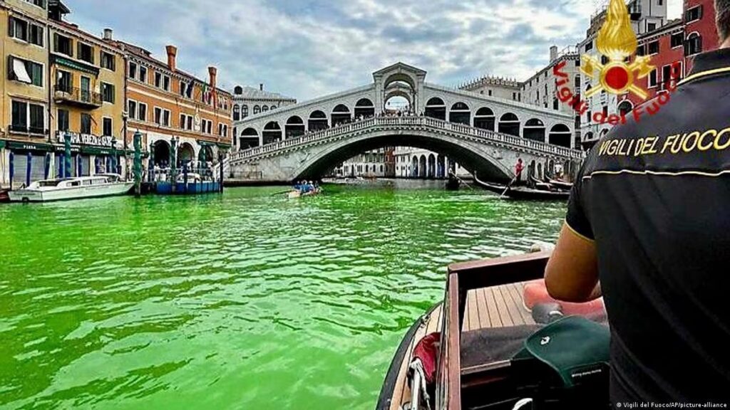 El agua del Gran Canal de Venecia, cerca del Puente de Rialto, se tiñó el pasado domingo de verde fluorescente, un líquido trazador que se utiliza para determinar el camino que sigue una filtración en el agua, mientras aún se desconocen el origen y los motivos de lo sucedido en medio de especulaciones de que se trata de una acción de activistas ecologistas.