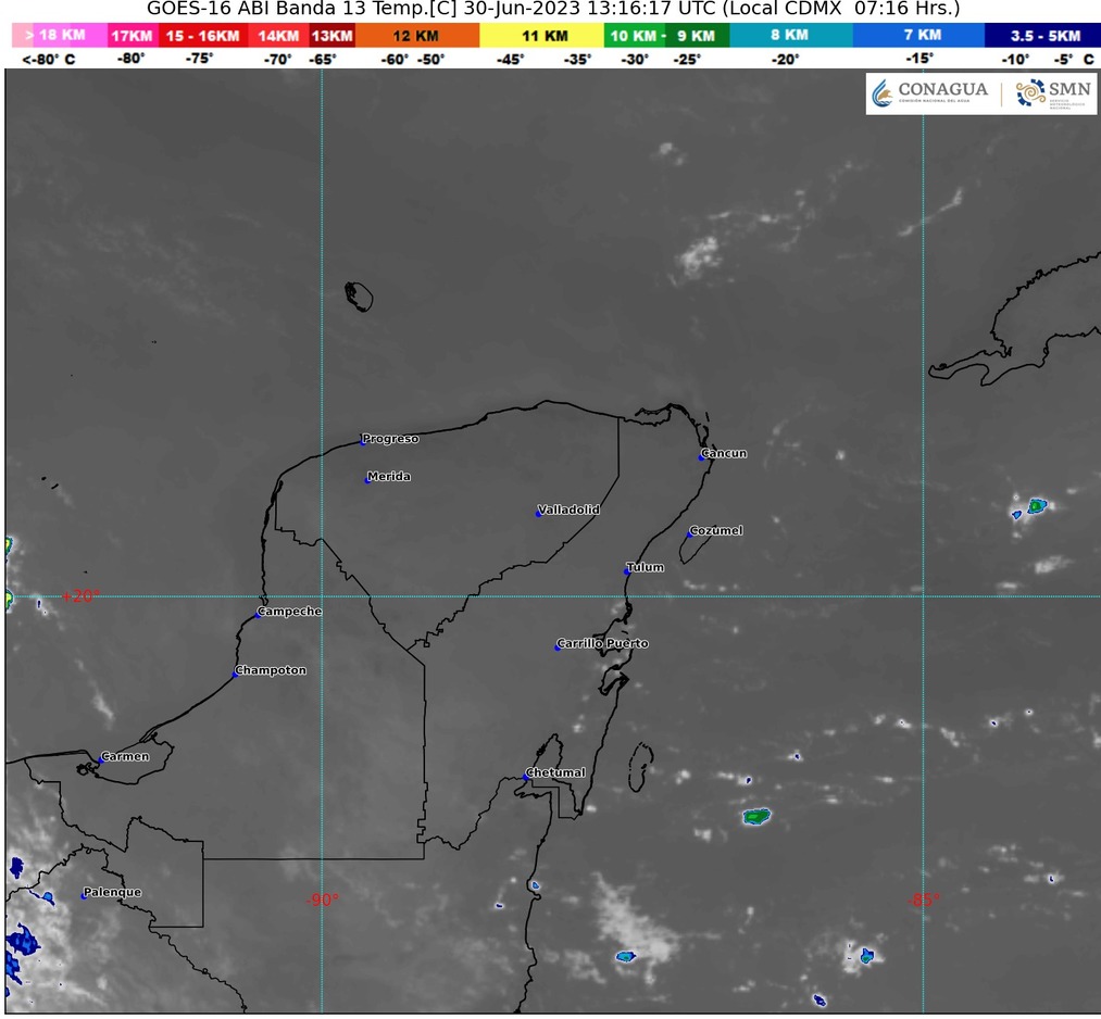 En la Península de Yucatán, el cielo estará parcialmente nublado por la mañana y nublado por la tarde con lluvias puntuales fuertes en Campeche, así como chubascos en Yucatán y Quintana Roo