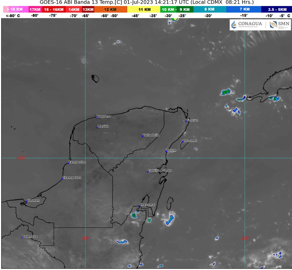 Para la Península de Yucatán cielo parcialmente nublado por la mañana y nublado por la tarde con lluvias puntuales fuertes en Campeche, así como chubascos en Yucatán y Quintana Roo.