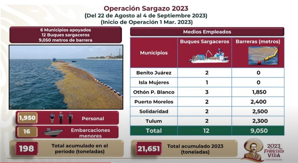 Dicha operación contempla el uso de 12 buques sargaceros, 16 embarcaciones menores, 9 mil 50 metros de barrera antisargazo y mil 950 personas trabajando
