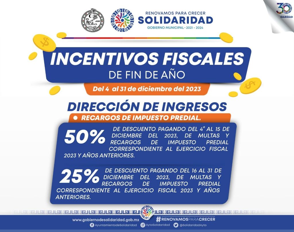 El gobierno de Solidaridad invita a los contribuyentes a pagar el impuesto predial 2024 en cualquiera de los 10 puntos establecidos en el municipio con descuentos que van desde el 25, 40 y 50% al pagar en una sola emisión un único predio habitacional con valor catastral de hasta 2 millones 74 mil 800.