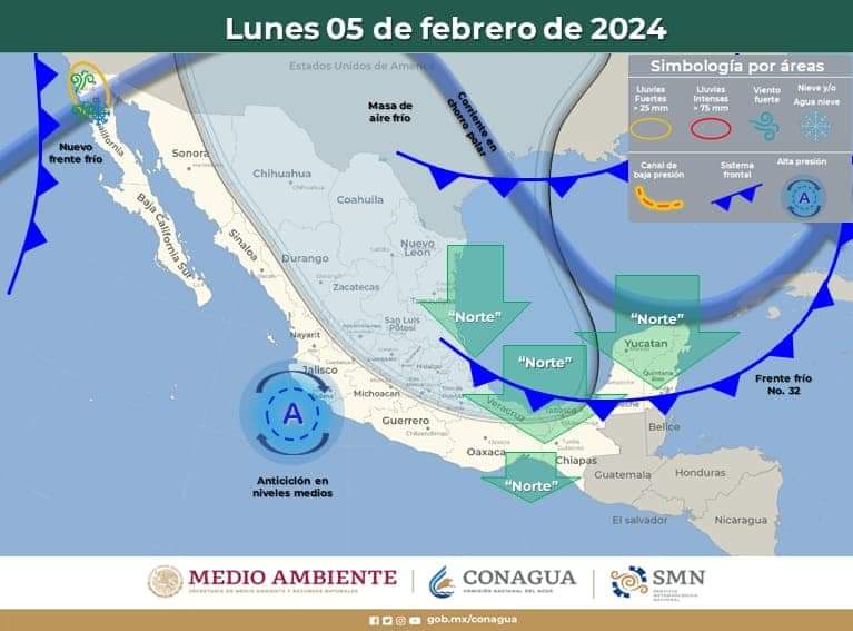 La masa de aire fría que impulsa al frente originará evento de “Norte” fuerte, principalmente en los municipios de la zona norte y a lo largo de las zonas costeras del Estado con vientos de 60 a 80 km/h durante los días lunes y martes, perdiendo intensidad durante el día miércoles.