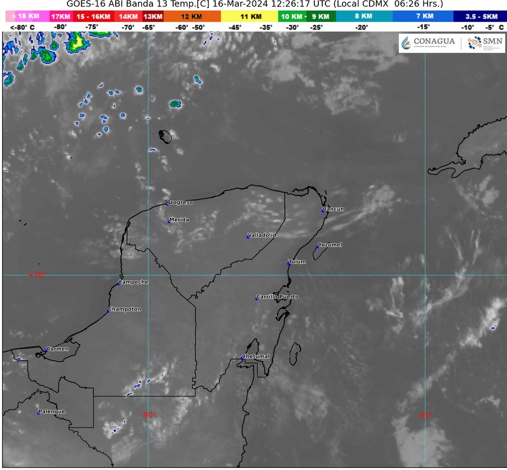 Para la Península de Yucatán, se prevé cielo medio nublado y lluvias aisladas en Campeche y Quintana Roo, sin lluvia en Yucatán. Se espera un ambiente templado durante la mañana y caluroso a muy caluroso por la tarde, con viento del este y sureste de 15 a 30 km/h, y rachas de 40 a 60 km/h en la región.