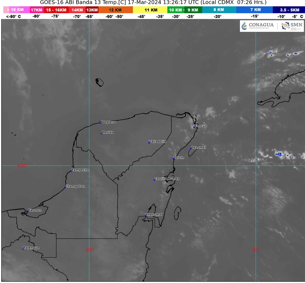 Península de Yucatán: Se espera cielo medio nublado durante el día con lluvias aisladas en Quintana Roo, sin precipitaciones en Campeche y Yucatán. El ambiente será templado a cálido durante la mañana, volviéndose caluroso a muy caluroso por la tarde en Quintana Roo y extremadamente caluroso en Campeche y Yucatán. Se registrarán vientos de componente este de 10 a 25 km/h con rachas de 40 a 60 km/h en la región.