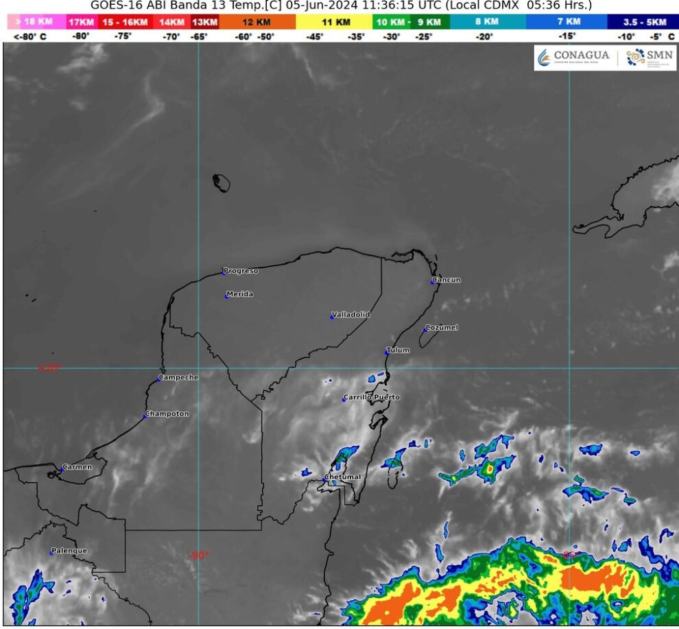 En la Península de Yucatán, el cielo estará medio nublado durante el día, con probabilidad de intervalos de chubascos en Quintana Roo y lluvias aisladas en Campeche y Yucatán.