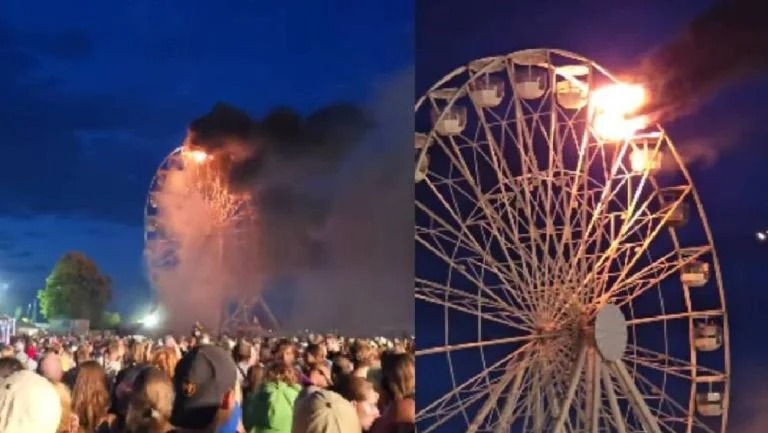 En los videos que circulan en redes sociales, se observa a asistentes cerca de una rueda de la fortuna, donde dos cabinas están en llamas mientras la rueda gira, generando humo negro.