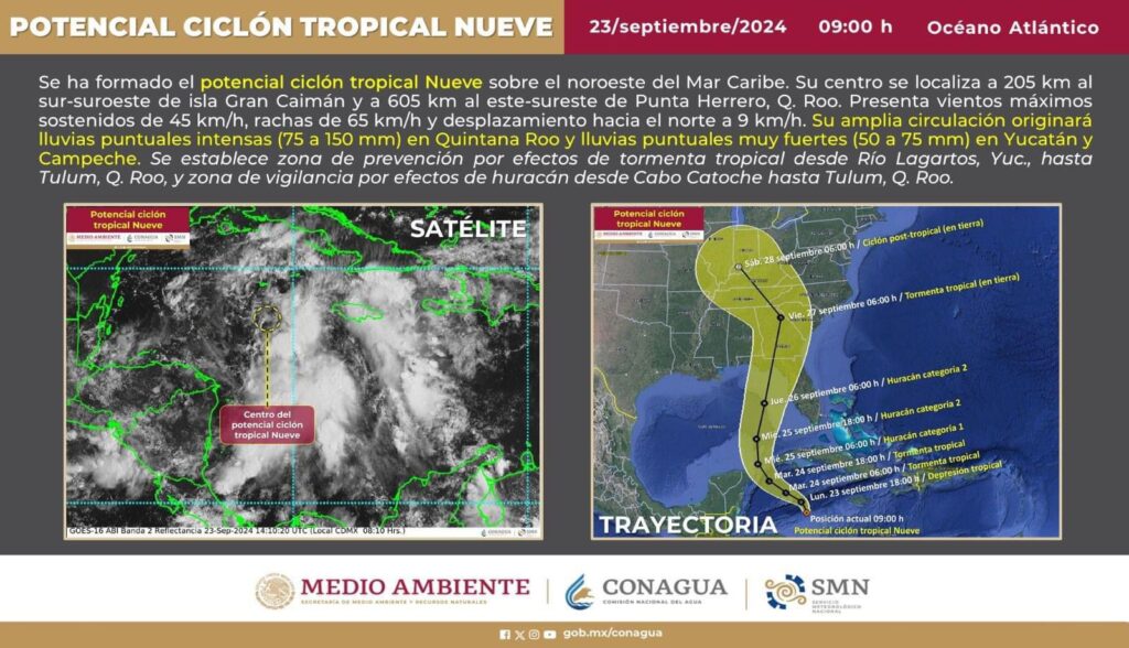#QUINTANAROO | ¡Aviso! Se ha formado el potencial ciclón tropical “Nueve” sobre el noroeste del Mar Caribe. Actualmente, su centro se localiza a 205 km al sur-suroeste de la isla Gran Caimán y a 605 km al este-sureste de Punta Herrero, Quintana Roo. El ciclón presenta vientos máximos sostenidos de 45 km/h, con rachas de hasta 65 km/h, y se desplaza hacia el norte a 9 km/h.