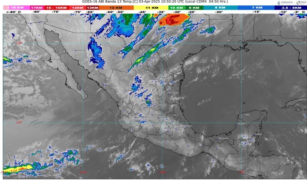 Una circulación anticiclónica en niveles medios de la atmósfera y el escaso contenido de vapor de agua, mantendrán baja probabilidad de lluvia y ambiente diurno caluroso a muy caluroso en gran parte de la República Mexicana.