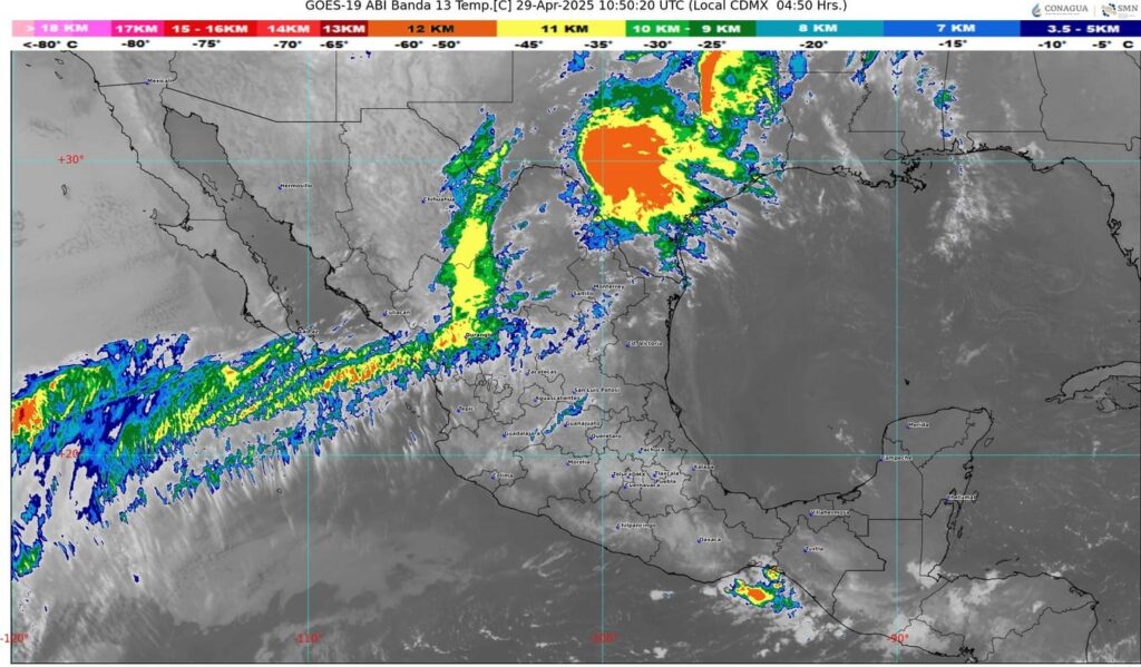 Asimismo, una circulación anticiclónica en niveles medios de la atmósfera, mantendrá ambiente caluroso a muy caluroso en el territorio mexicano, y prevalecerá la onda de calor en zonas de Jalisco (centro y sureste), Colima (este y noreste), Michoacán (oeste, suroeste, centro y sureste), Guerrero (noroeste, norte, sur y sureste), Oaxaca (suroeste y sur), Chiapas (oeste), Nuevo León (oeste), Estado de México (suroeste), Ciudad de México y Morelos.