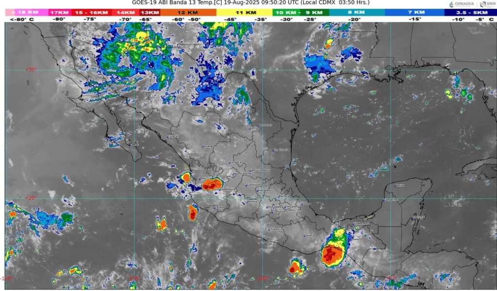 Se prevén lluvias puntuales intensas en Chiapas y puntuales fuertes en Campeche y Tabasco, debido a un canal de baja presión y la entrada de aire húmedo del mar Caribe en el sureste mexicano. La onda tropical número 23 frente a las costas de Michoacán, se desplazará hacia el oeste y ocasionará lluvias puntuales muy fuertes en Michoacán y puntuales fuertes en Jalisco y Colima.