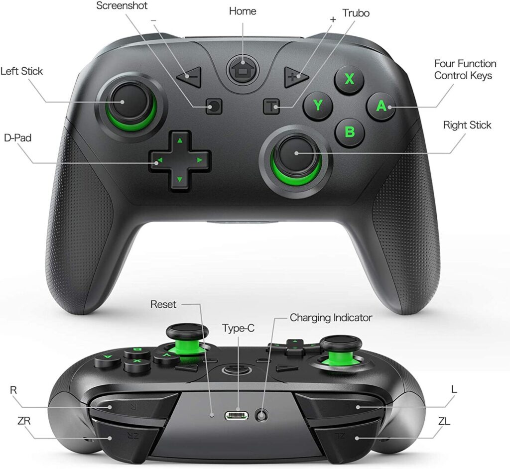 Tiene un diseño estándar de controles para videojuegos, incluye su botón de captura de fotos y video además de tener funciones turbo. A pesar de su bajo costo, es inalámbrico, tiene dos motores de vibración, giroscopio y su batería de 1,200 mAh tiene una duración aproximada de ocho horas y se carga por medio de USB tipo C.