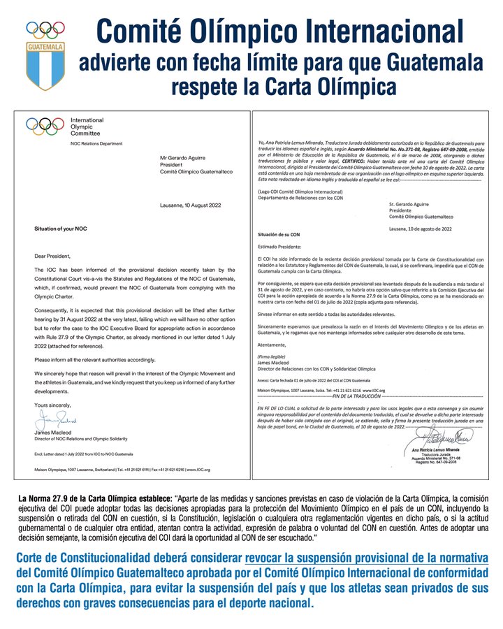 “El COI ha sido informado de la reciente decisión provisional tomada por la Corte de Constitucionalidad con relación a los Estatutos y Reglamentos del CON (Comité Olímpico Nacional) de Guatemala, la cual, si se confirmara impedirá que el CON de Guatemala cumpla con la Carta Olímpica”, se lee en el primer párrafo de la carta enviada por el Comité Olímpica Internacional.